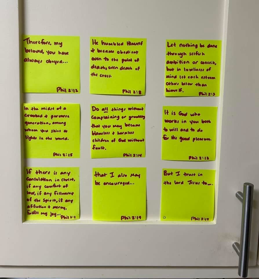 God gave me the idea to write my favorite scriptures on Post-It notes and stick them on my kitchen cabinets. If you have a minute, I would love to share some verses with you from Philippians that gave me hope and helped me get through my day. (I hung them in my kitchen so I could read Paul's encouraging words before leaving to school each morning).